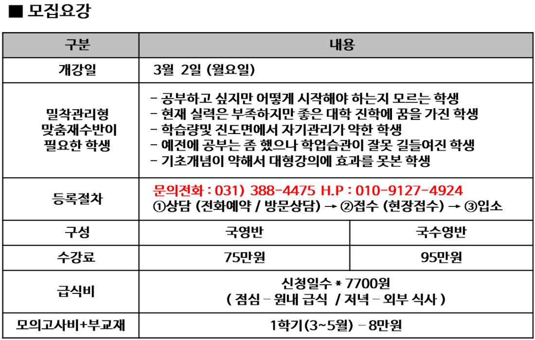 소수정예 재원생 전원 모두 국영 3등급 이상, 탐구 1~2등급을 목표로